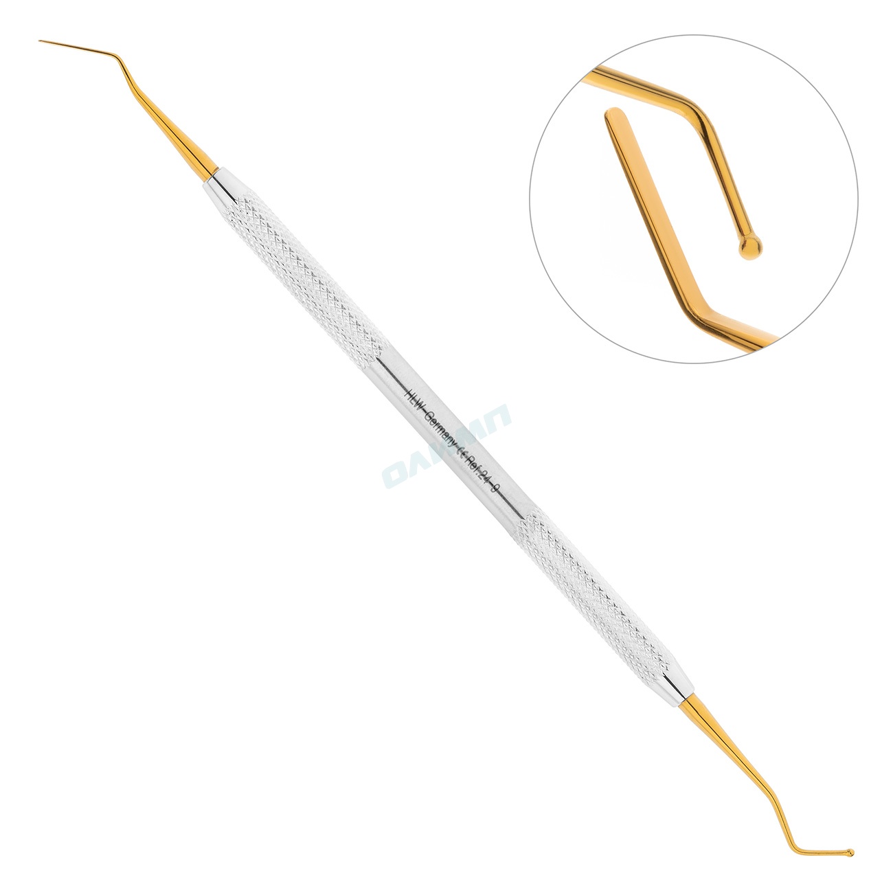 Рабочие части и функциональные стержни стоматологической гладилки-штопфера имеют нитрид титановое покрытие, уменьшающее адгезию композитов к поверхности инструмента и предотвращающее окрашивание реставраций частицами металла, а также используются для контраста.