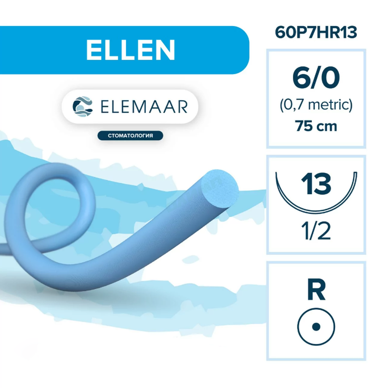 Шовный материал ELLEN – синтетическая нерассасывающаяся мононить из полипропилена. Материал практически не вызывает реакции в тканях ротовой полости, не токсичен, не впитывает жидкость из прокольного канала.