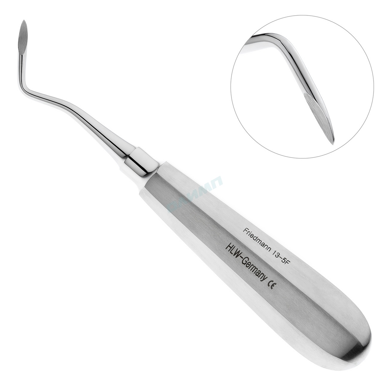 Ширина щечки изогнутого инструмента 3 мм. Рабочая часть элеватора слегка вогнутая, острая на конце и ориентирована от себя. Щечка инструмента вводится между корнем зуба и стенкой альвеолы, и путем вращения рукоятки элеватора против хода часовой стрелки осуществляется вывихивание зуба.