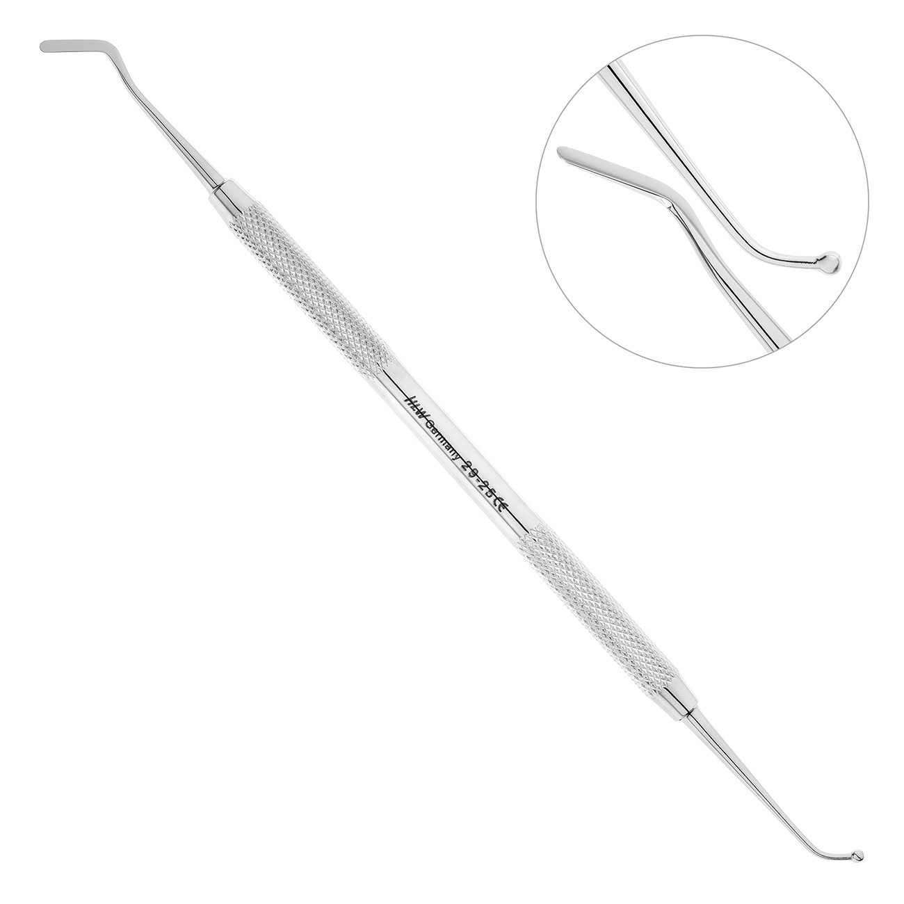 Двусторонний инструмент представляет собой держатель в виде стержня, на обоих концах которого расположены асимметричные рабочие части, одна из которых имеет шаровидную форму диаметром 2 мм для уплотнения и распределения пломбировочного материала по стенкам зуба. Противоположная рабочая часть стоматологического инструмента представлена в виде плоской лопатки с закругленным окончанием, что очень удобно при нанесении пломбировочного материала на поверхность зуба.