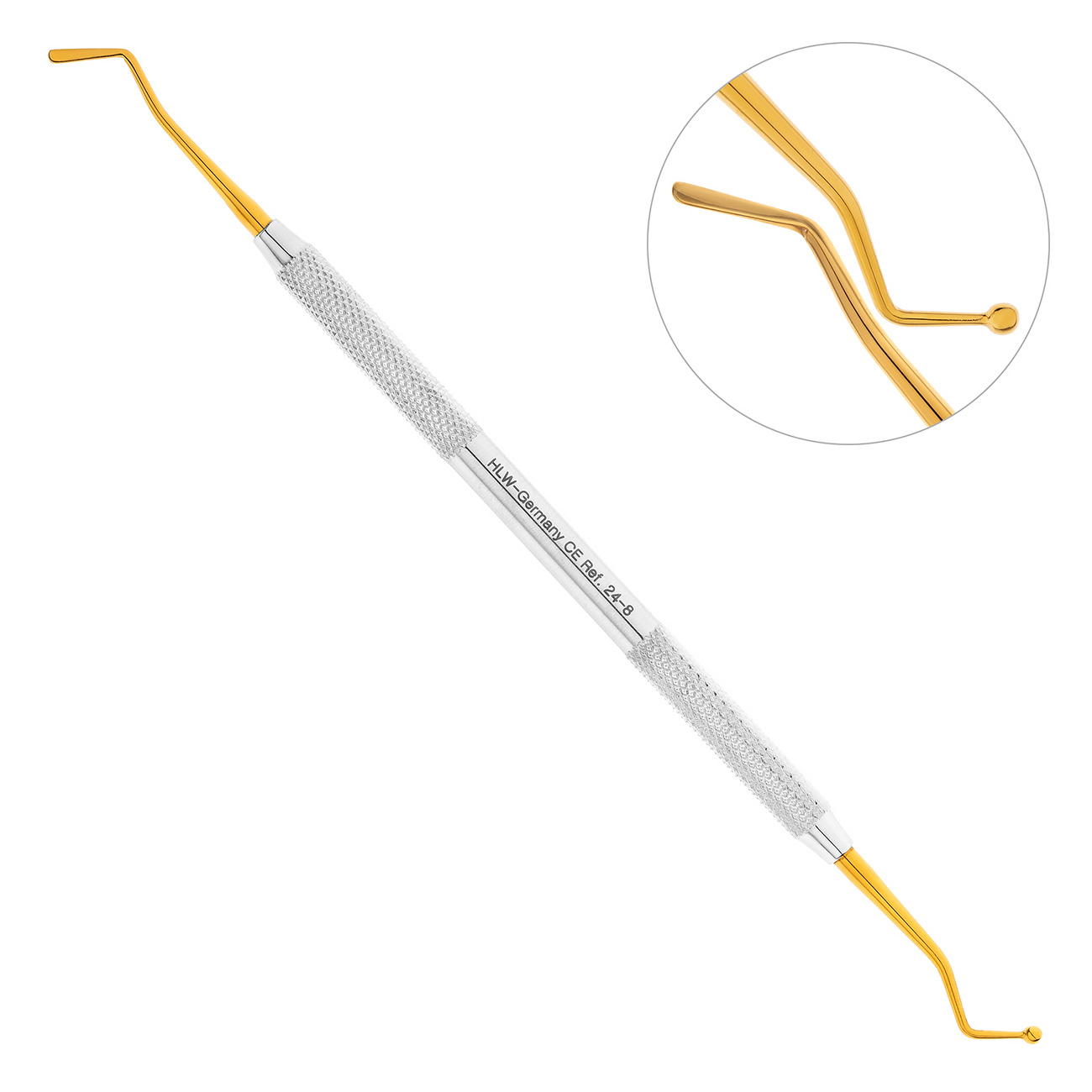 С обоих концов двусторонней гладилки-штопфера расположены отличные друг от друга рабочие части. Одна из рабочих частей имеет шаровидное строение диаметром 2,4 мм, предназначенное для уплотнения пломбировочного материала в обработанную кариозную полость. Противоположная рабочая часть стоматологического инструмента представлена в виде плоской лопатки с закругленным концом шириной 2 мм.