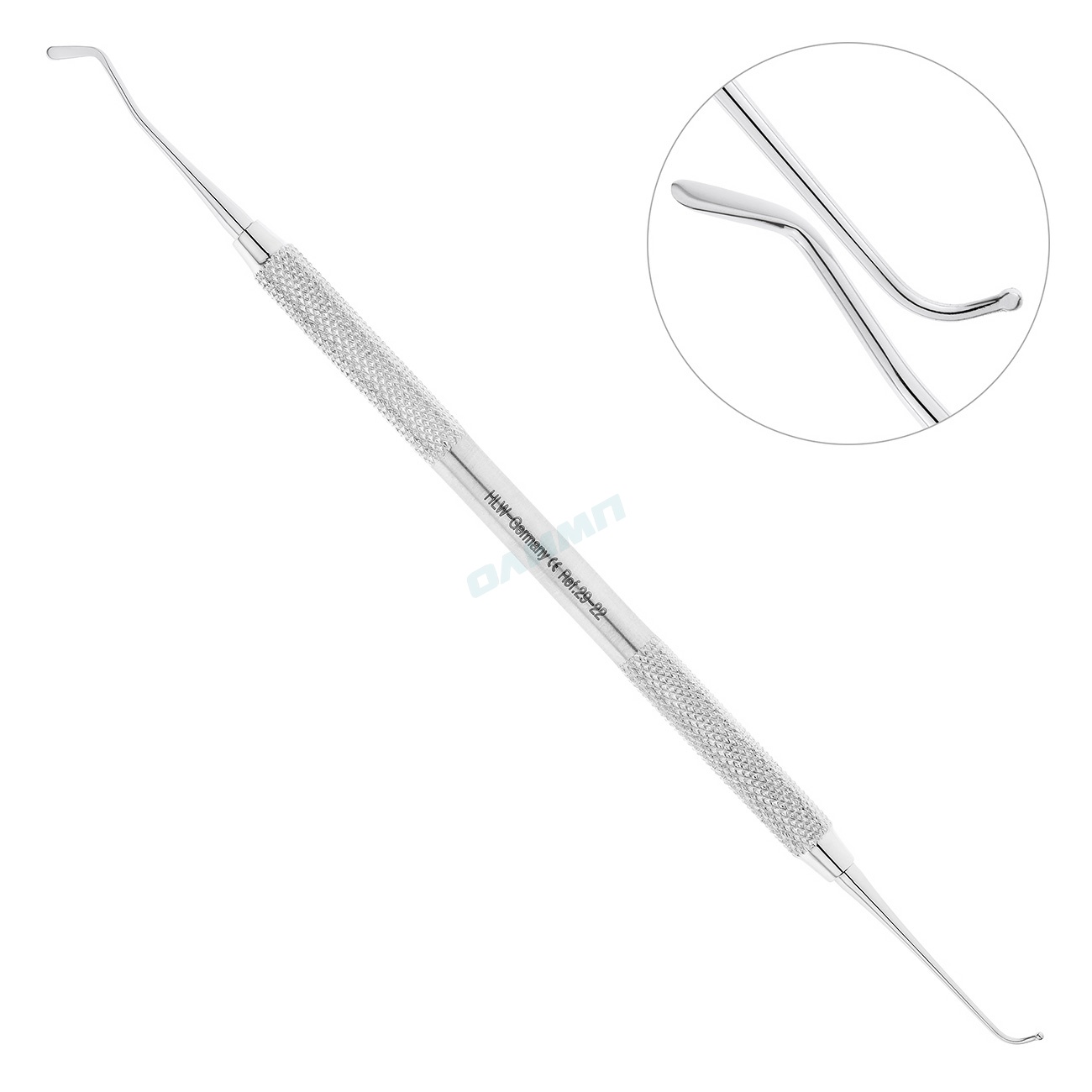 С обоих концов двусторонней гладилки-штопфера расположены отличные друг от друга рабочие части, одна из которых имеет шаровидное строение диаметром 1 мм, предназначенное для уплотнения пломбировочного материала в обработанную кариозную полость. Противоположная рабочая часть стоматологического инструмента представлена в виде плоской лопатки с закругленным концом, что очень удобно при нанесении пломбировочного материала на поверхность зуба.