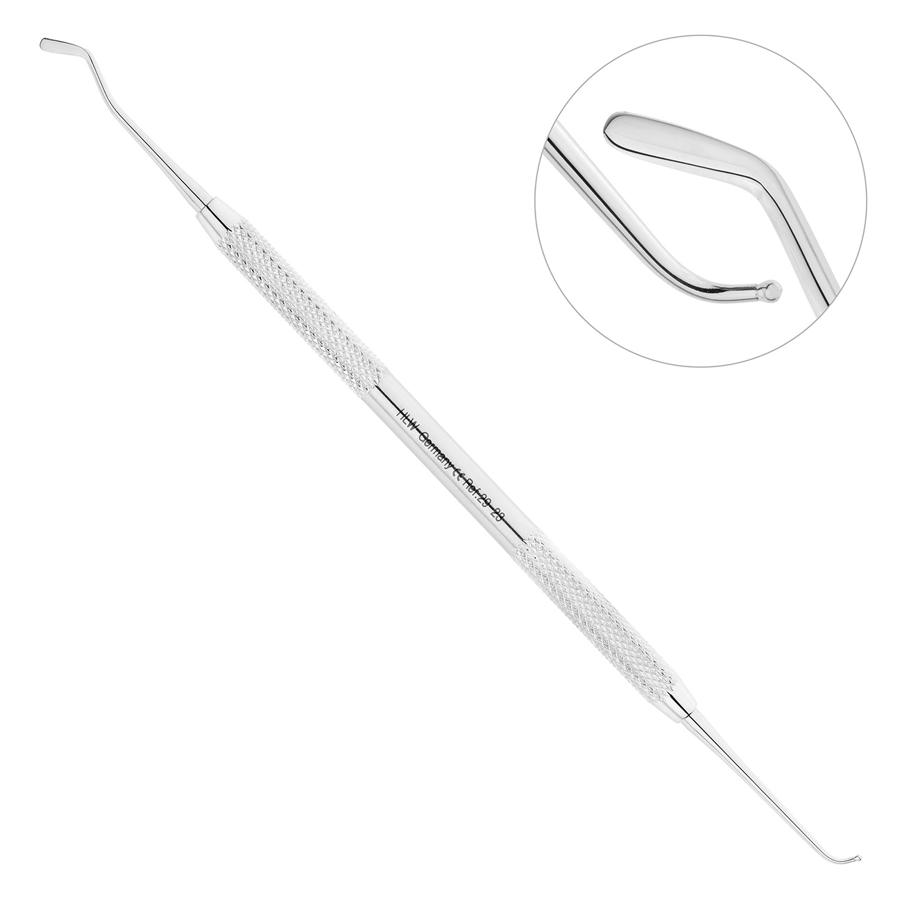С обоих концов двусторонней гладилки-штопфера расположены отличные друг от друга рабочие части, одна из которых имеет шаровидное строение диаметром 1,0 мм, предназначенное для уплотнения пломбировочного материала в обработанную кариозную полость. Противоположная рабочая часть стоматологического инструмента представлена в виде плоской лопатки с закругленным концом, что очень удобно при нанесении пломбировочного материала на поверхность зуба.