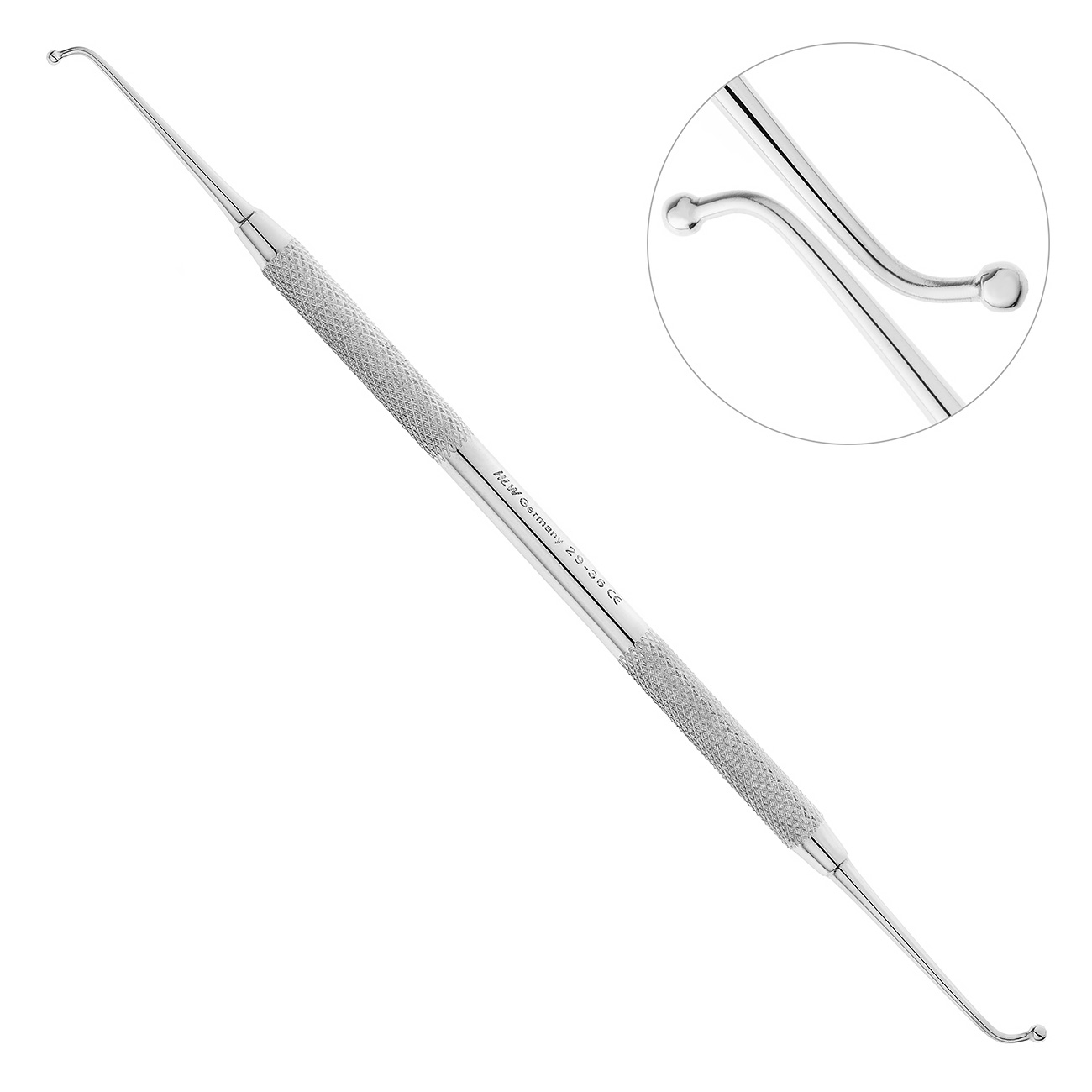 Двусторонний инструмент представляет собой держатель в виде стержня, на обоих концах которого расположены рабочие части шаровидной формы. Диаметр одного конца рабочей части 2 мм, другого- 2,5 мм. Такое строение инструмента прекрасно подходит для пломбирования жевательных зубов при помощи конденсируемых композитов. Также разные рабочие части можно использовать в зависимости от размера кариозной полости.