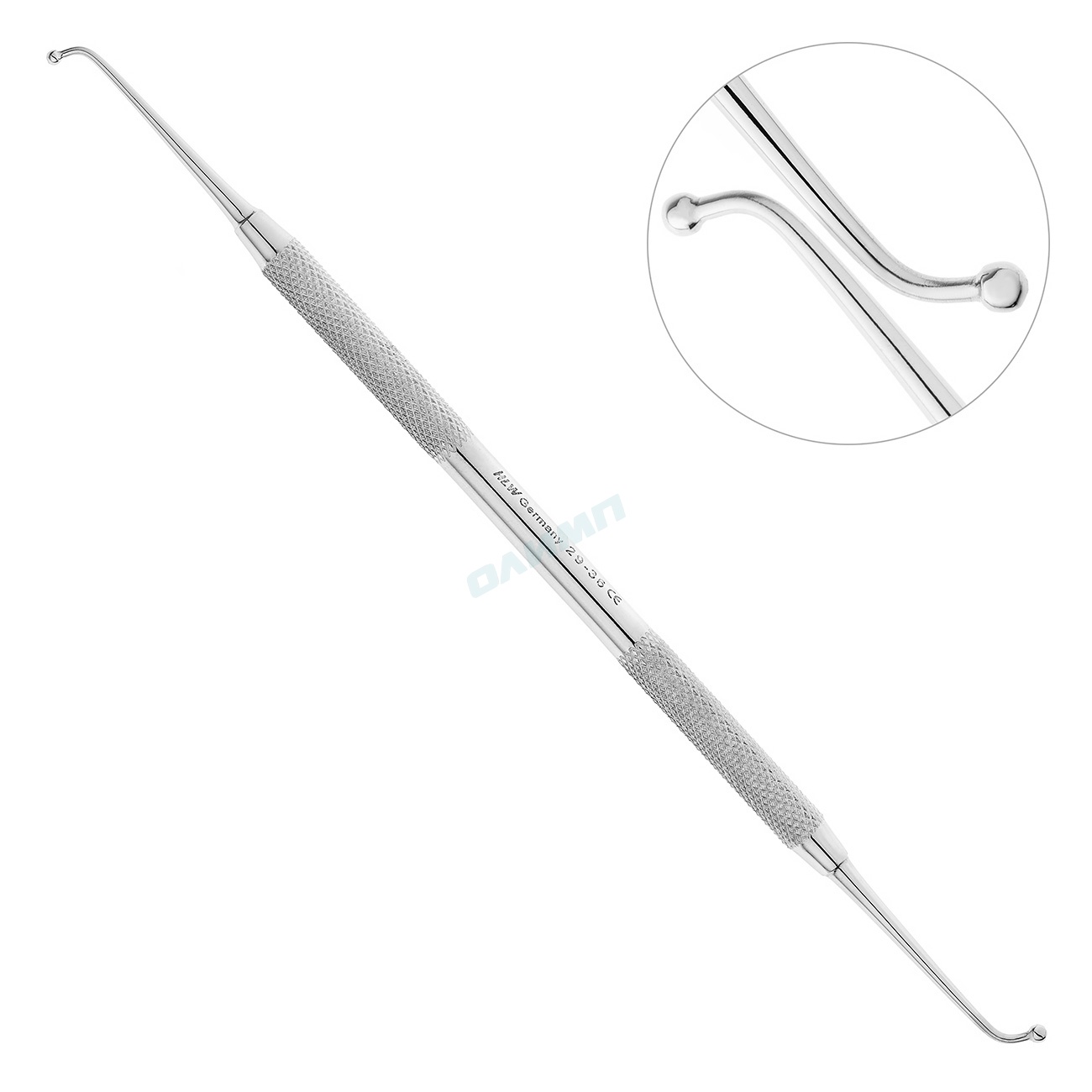 Цилиндрическая ручка стоматологического инструмента удобна в использовании и предотвращает скольжение фаланг пальцев в перчатке, благодаря ретенционным узорам на поверхности рукоятки.