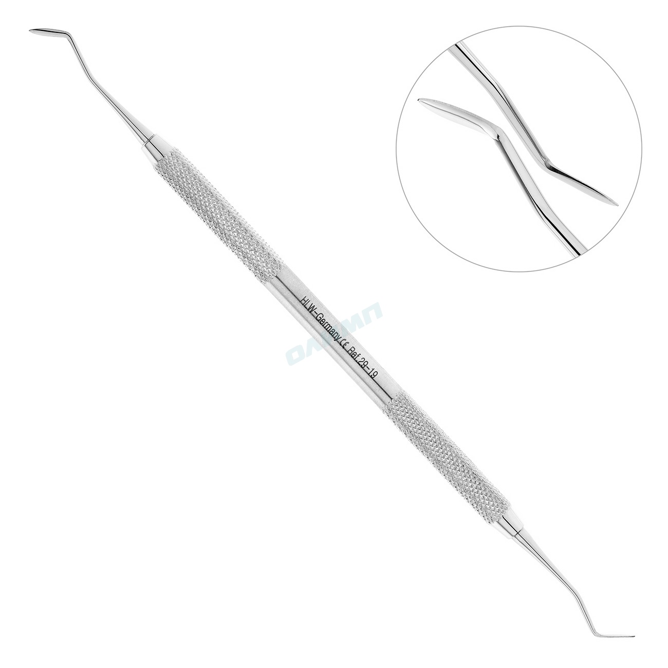 С обоих концов двусторонней гладилки расположены рабочие части с заостренными окончаниями, одна из которых прямая, а другая обратная. Такая конструкция инструмента позволяет эффективно наносить и распределять рабочий материал по стенкам зуба.