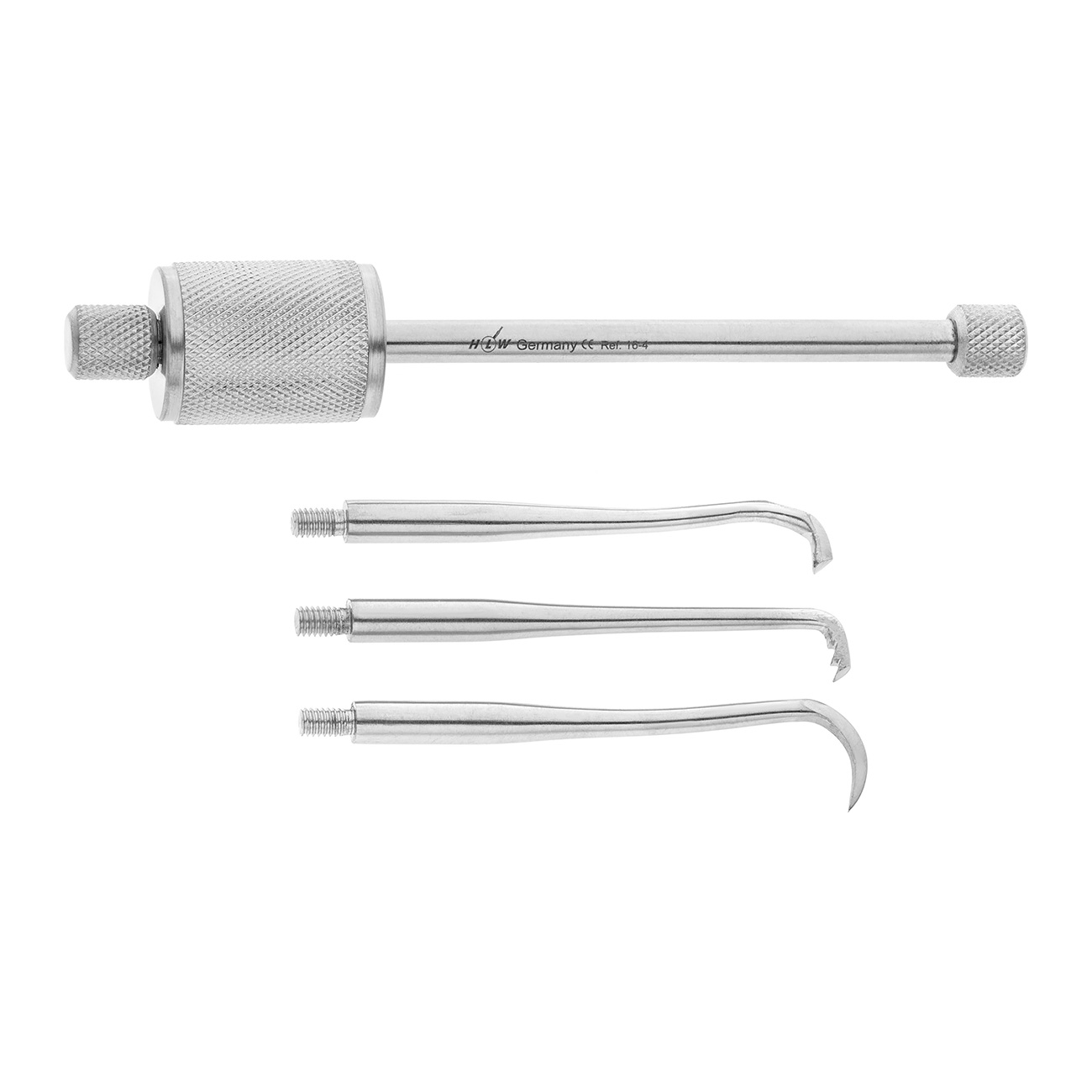 В комплект входят три сменные насадки различной формы рабочей части: серповидная, прямоугольная с насечками и прямоугольная с двойным изгибом. Благодаря отличающимся друг от друга насадкам коронкосниматель можно применять для снятия разных протезов.