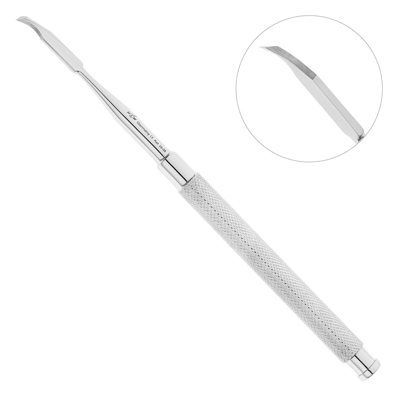 На внешнюю поверхность круглой ручки стоматологического долота нанесены ретенционные узоры, предотвращающие скольжение фаланг пальцев в перчатке, а также позволяющие снизить нагрузку на руку при проведении операции.