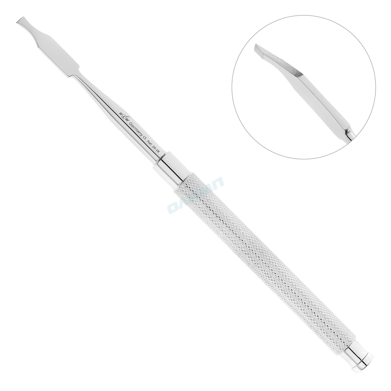 Цилиндрическая ручка стоматологического инструмента удобна в использовании и предотвращает скольжение фаланг пальцев в перчатке, благодаря ретенционным узорам на поверхности рукоятки.