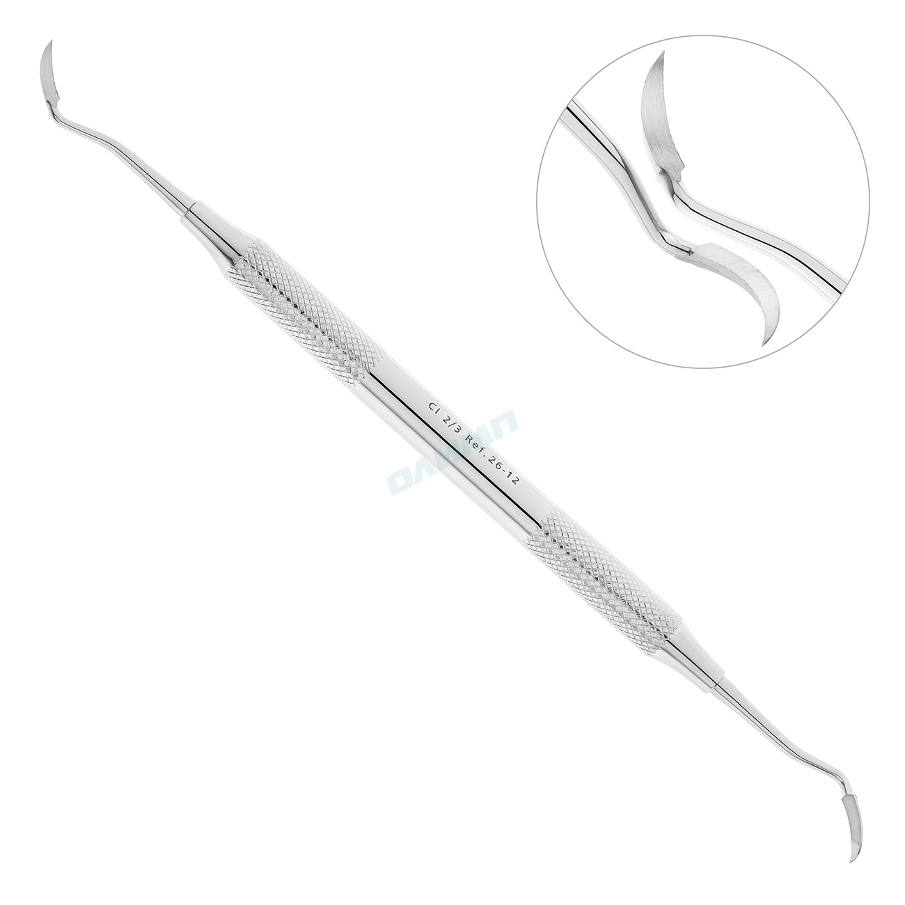 Двойной разносторонний изгиб по ребру в области функционального стержня позволяет использовать инструмент в глубоких и труднодоступных участках полости рта.