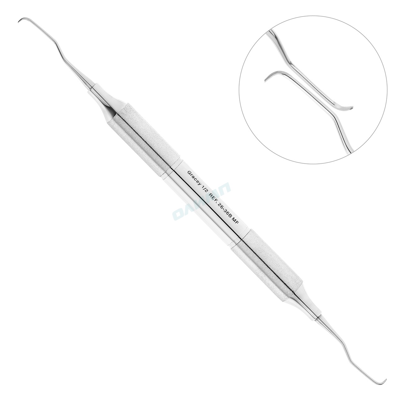 Рабочая часть двустороннего инструмента имеет укороченный рабочий кончик, полукруглое сечение и режущую кромку, расположенную под углом 70° по отношению к терминальному стержню. Такая конструкция кюреты идеально подходит для работы в глубоких пародонтальных карманах.