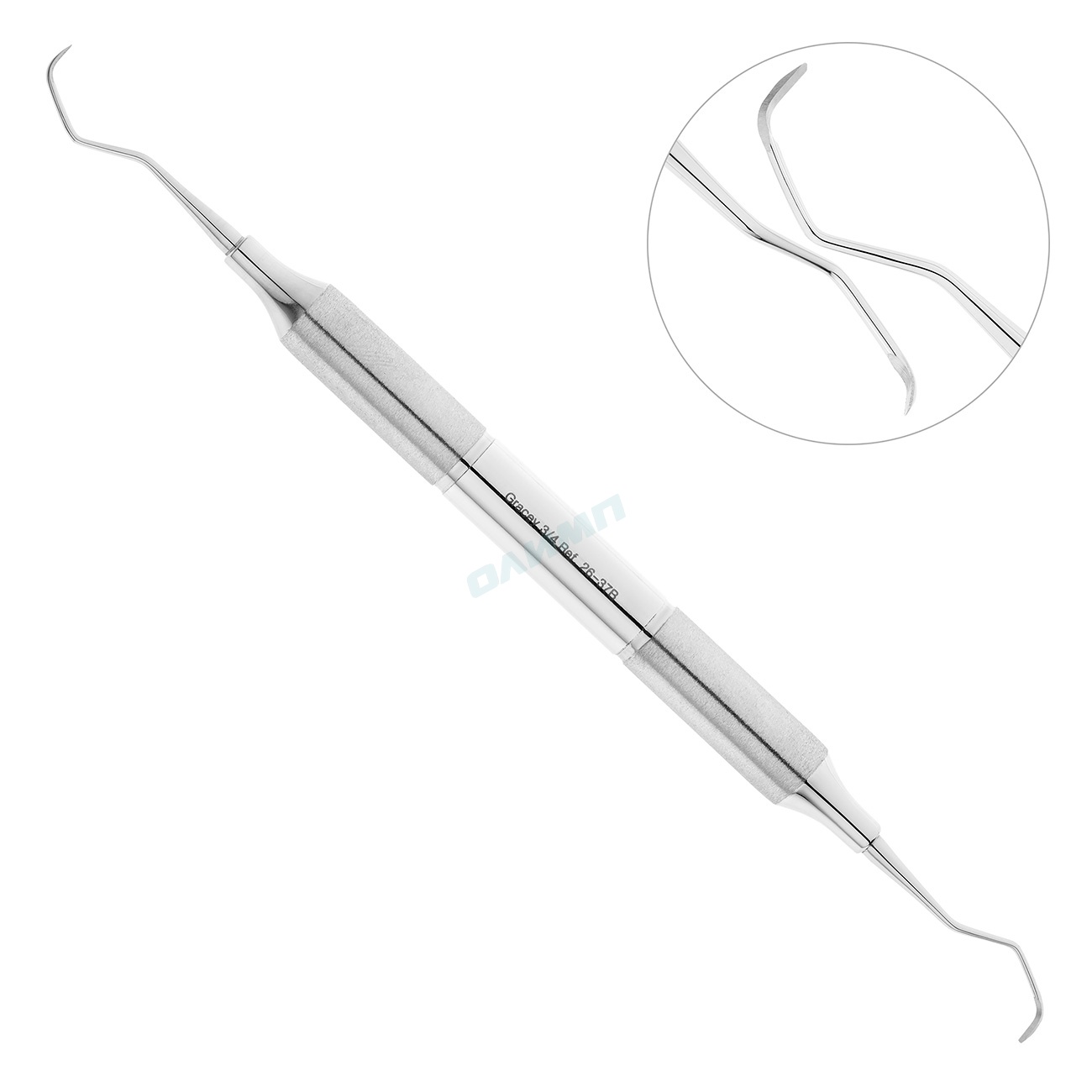 Ручка кюреты двусторонняя. С обоих концов рукоятки расположены зеркально отраженные рабочие части, каждая из которых имеет закругленный кончик, полукруглое сечение и режущую кромку, расположенную под углом 70° по отношению к терминальному стержню. Конструкция кюреты идеально подходит для работы в узких и глубоких пародонтальных карманах.