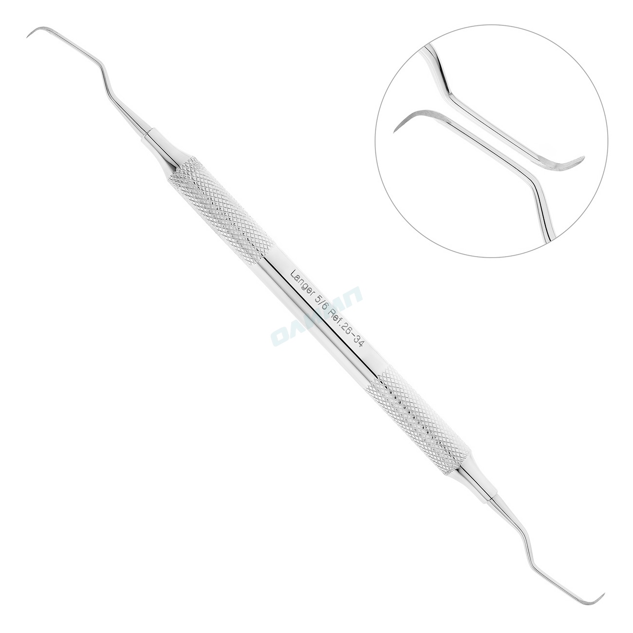 Двусторонний инструмент имеет две острые рабочие кромки и закругленный кончик. Лицевая поверхность рабочей части кюреты расположена под углом 900 к терминальному стержню. Такая форма рабочей части данного инструмента идеально сглаживает корневые поверхности. Причем при работе могут использоваться обе острые режущие кромки.