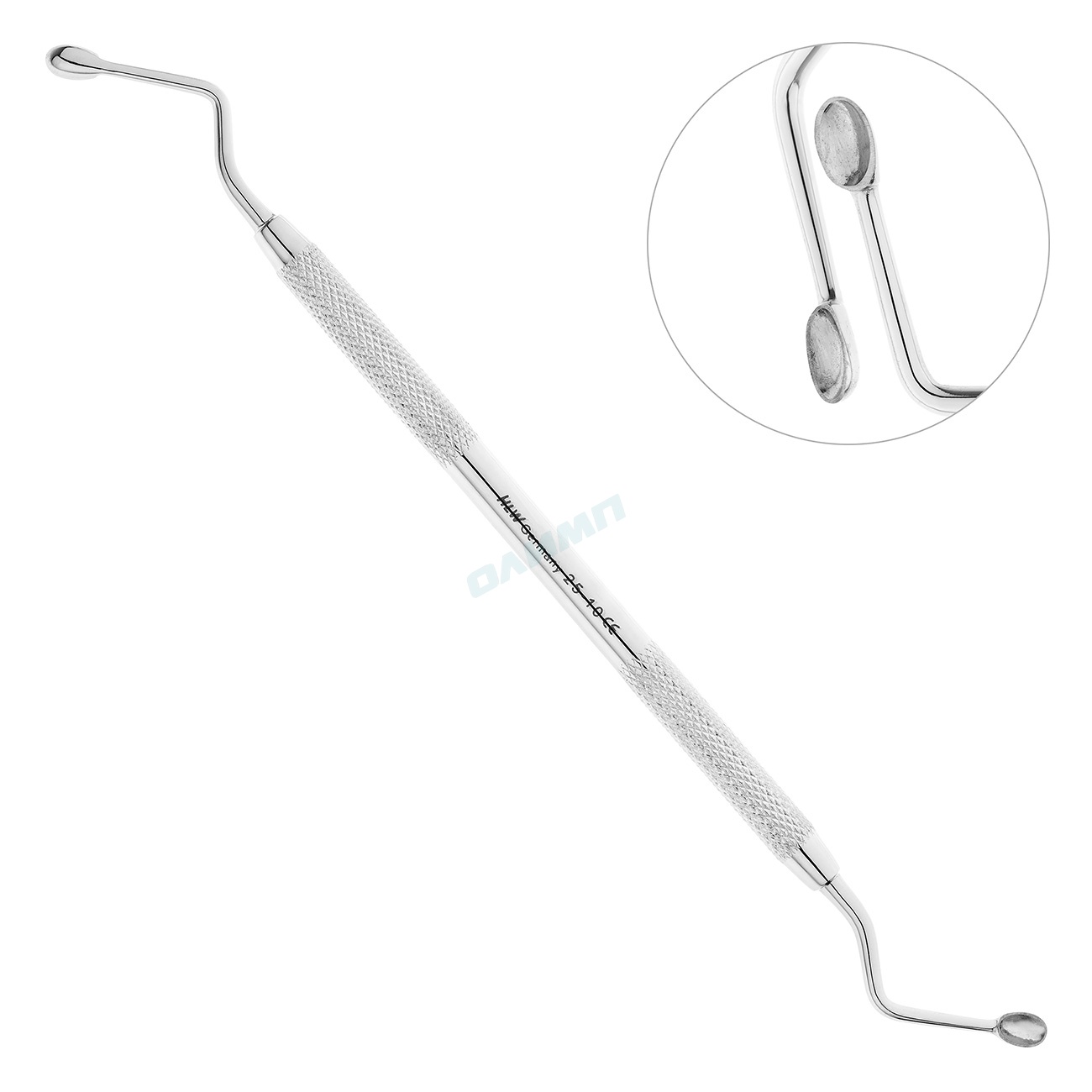 С обоих концов двустороннего инструмента расположены симметричные рабочие части шириной по 4 мм каждая. Концы рабочих частей представляют собой ложки овальных форм с острыми краями.