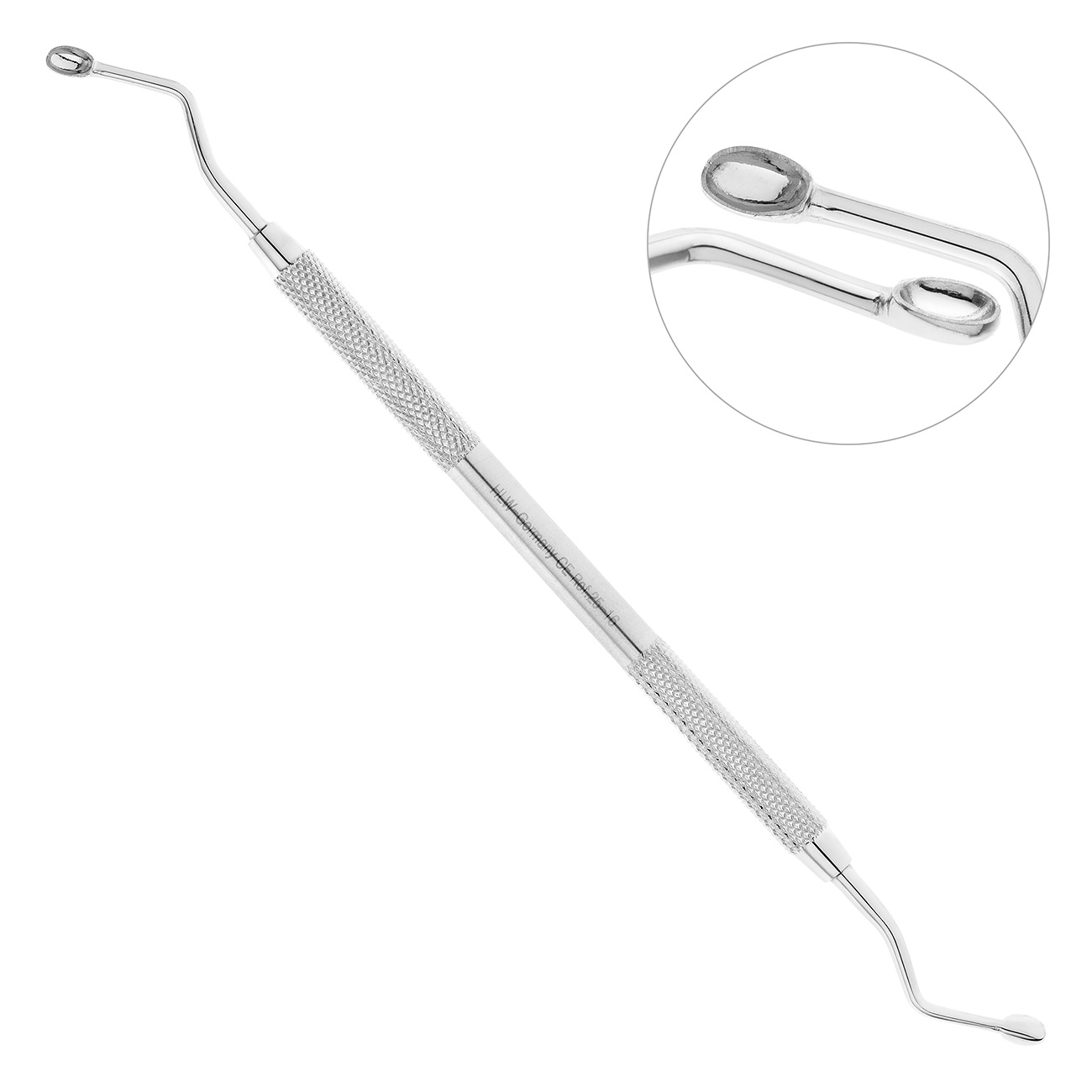 Инструмент удобно использовать в удаленных и труднодоступных отделах ротовой полости, благодаря удлиненной рукоятке и S-образным изгибам в области рабочих частей.