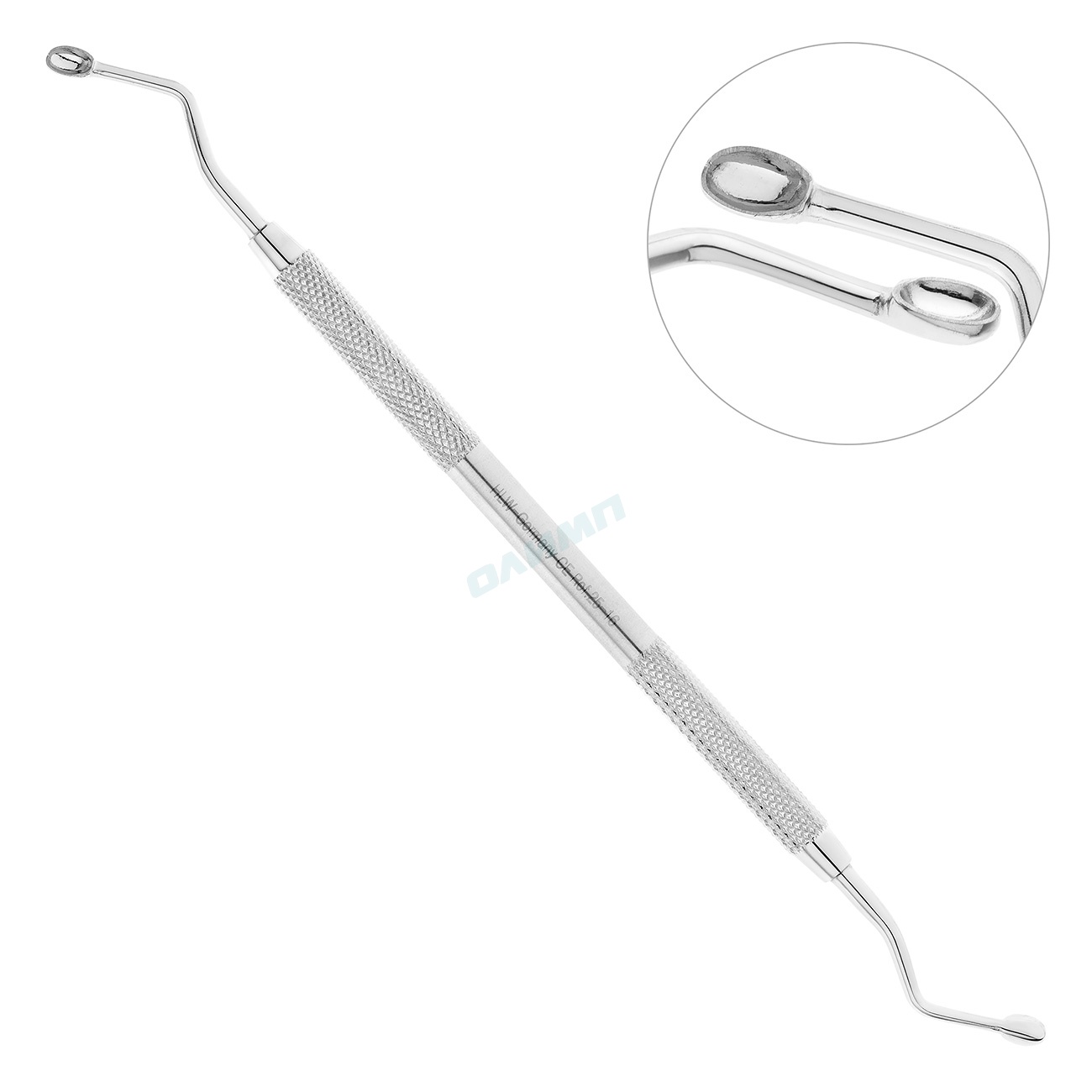 С обоих концов двусторонней кюретажной ложки расположены симметричные рабочие части шириной по 4 мм каждая. Концы рабочих частей представляют собой ложки овальных форм с острыми краями.