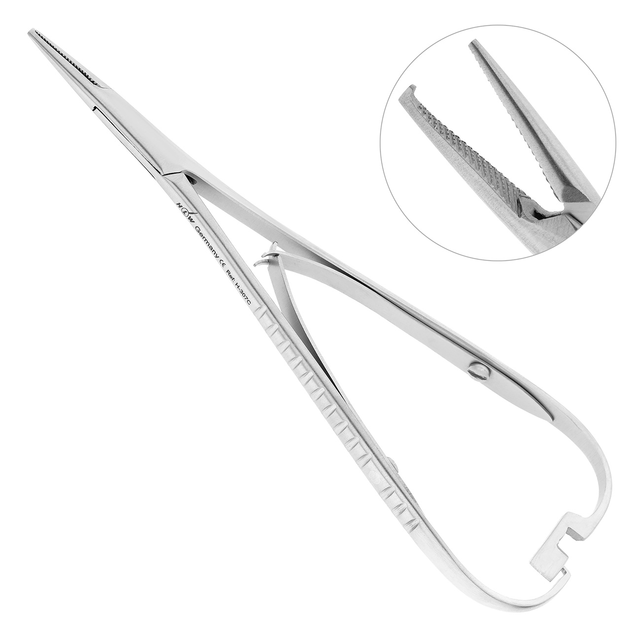 На ручки снаружи перпендикулярно оси инструмента нанесены ретенционные бороздки, предупреждающие скольжение фаланг пальцев в перчатке. С внутренней стороны к каждой ручке прикреплена пластиночная разводная пружина, увеличивающая срок службы и обеспечивающая плавный ход иглодержателя. Инструмент снаружи снабжен кремальерным замком, который размыкается при дальнейшем сжатии рукоятки.