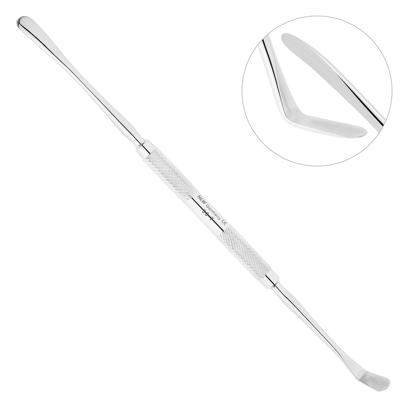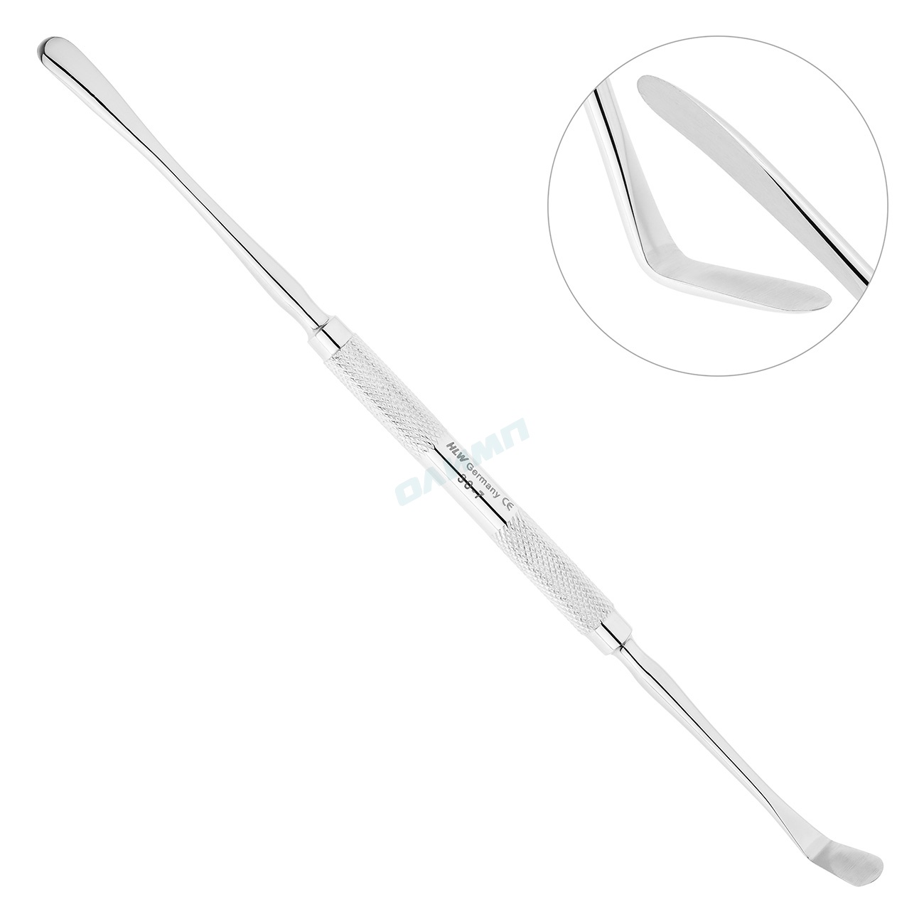 Рабочие части распатора отличаются друг от друга и расположены с обоих концов двустороннего инструмента. На конце одной рабочей поверхности расположена режущая грань закругленной формы шириной 6,5 мм. Противоположное окончание распатора имеет закругленную и режущую грань шириной 6 мм, а также изгиб по плоскости, благодаря которому удобно проводить манипуляции в труднодоступных участках полости рта.
