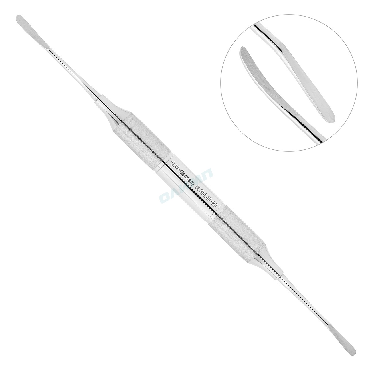 Двусторонний инструмент представляет собой держатель в виде стержня, на обоих концах которого расположены рабочие части, каждая из которых имеет каплевидную форму с остро заточенными гранями и шириной 2,8 мм. Такая конструкция распатора позволяет без затруднений проводить атравматическое препарирование при имплантации и пародонтологических операциях.