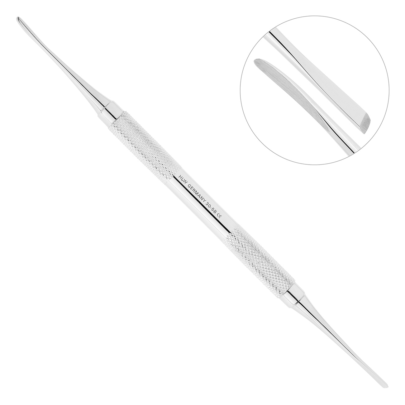 Цилиндрическая ручка стоматологического инструмента очень удобна в использовании. На внешнюю поверхность рукоятки инструмента с обоих концов нанесены ретенционные узоры, предотвращающие скольжение фаланг пальцев в перчатке и снижающие нагрузку на руку.