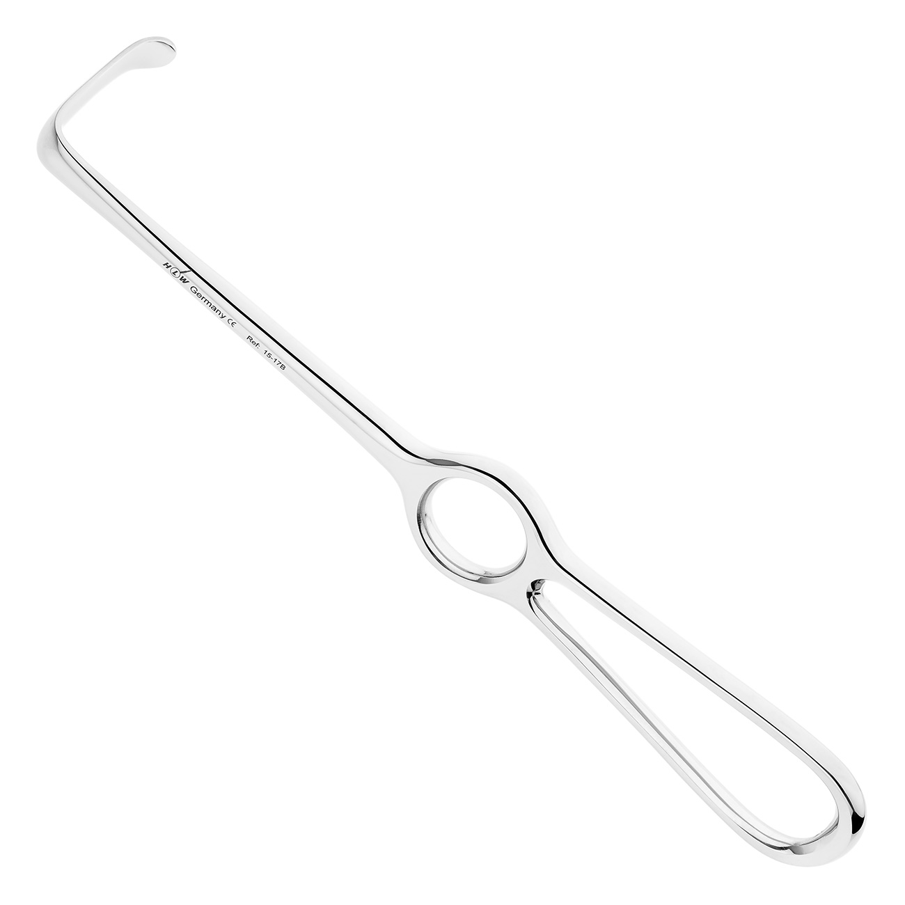 Ручка инструмента удобна в использовании. Пальцы руки фиксируются в отверстиях рукоятки, благодаря чему ретрактор надежно держится в руке и способствует успешному проведению операции.