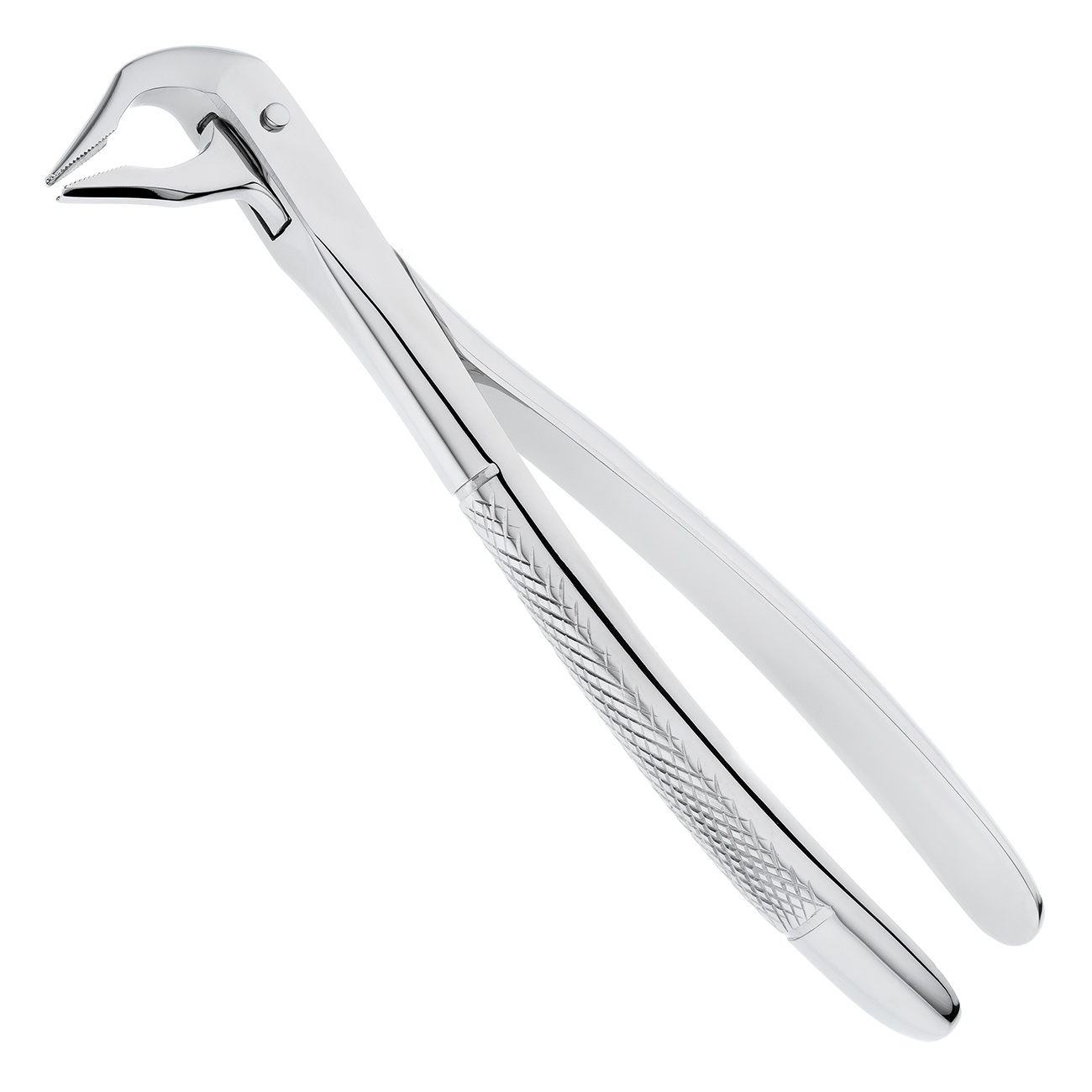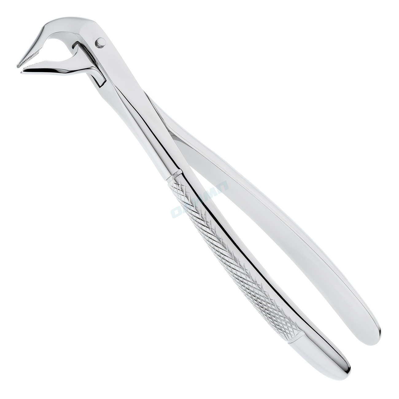 Рабочие части щипцов не сходящиеся, узкие, удлиненные и имеют продольно-поперечные насечки на внутренних поверхностях щечек инструмента, за счет которых осуществляется надежный захват и фиксация щипцов на корне зуба.