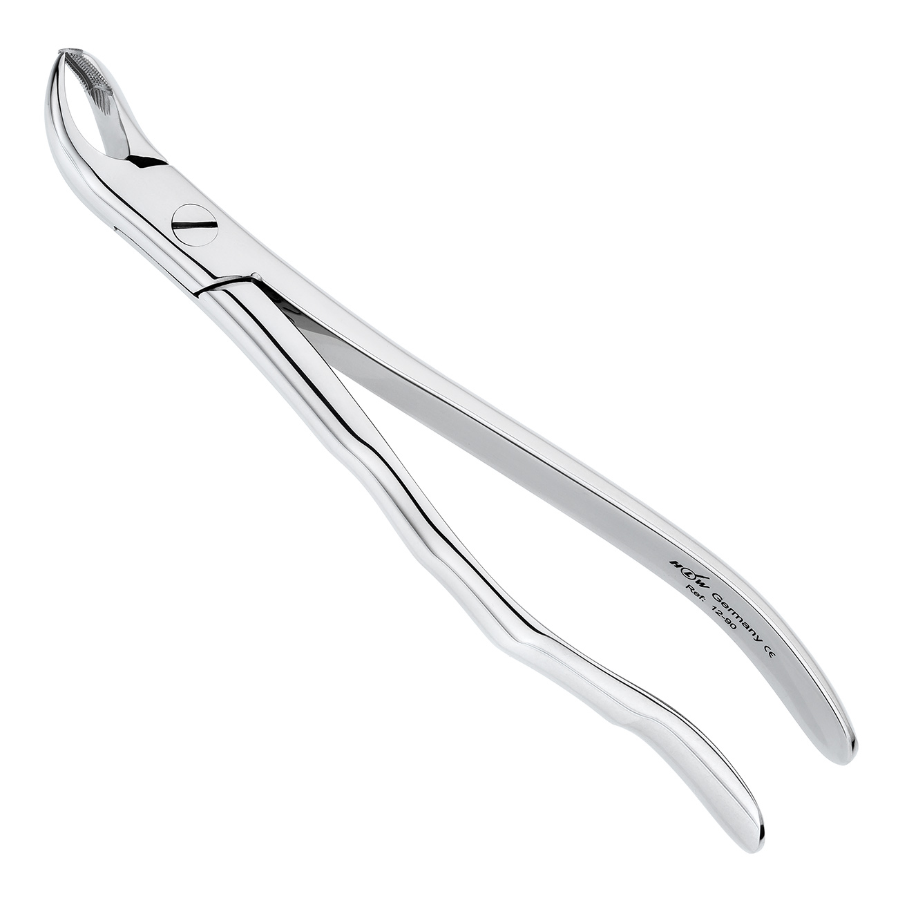 Щипцы формы №90 от немецкого производителя HLW Dental Instruments используются для удаления левых моляров на верхней челюсти.