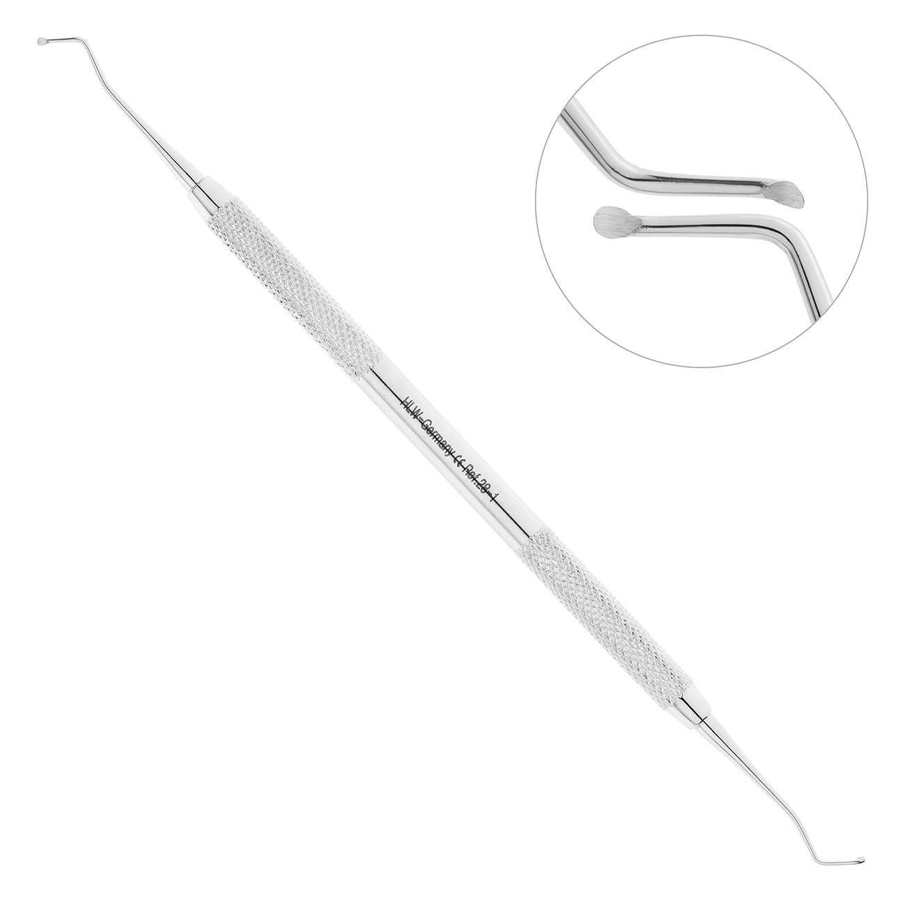 Каждая из симметричных рабочих частей двустороннего экскаватора имеет форму круглой ложки с острыми краями, которые позволяют атравматично удалять размягченные ткани зуба из кариозной поверхности.