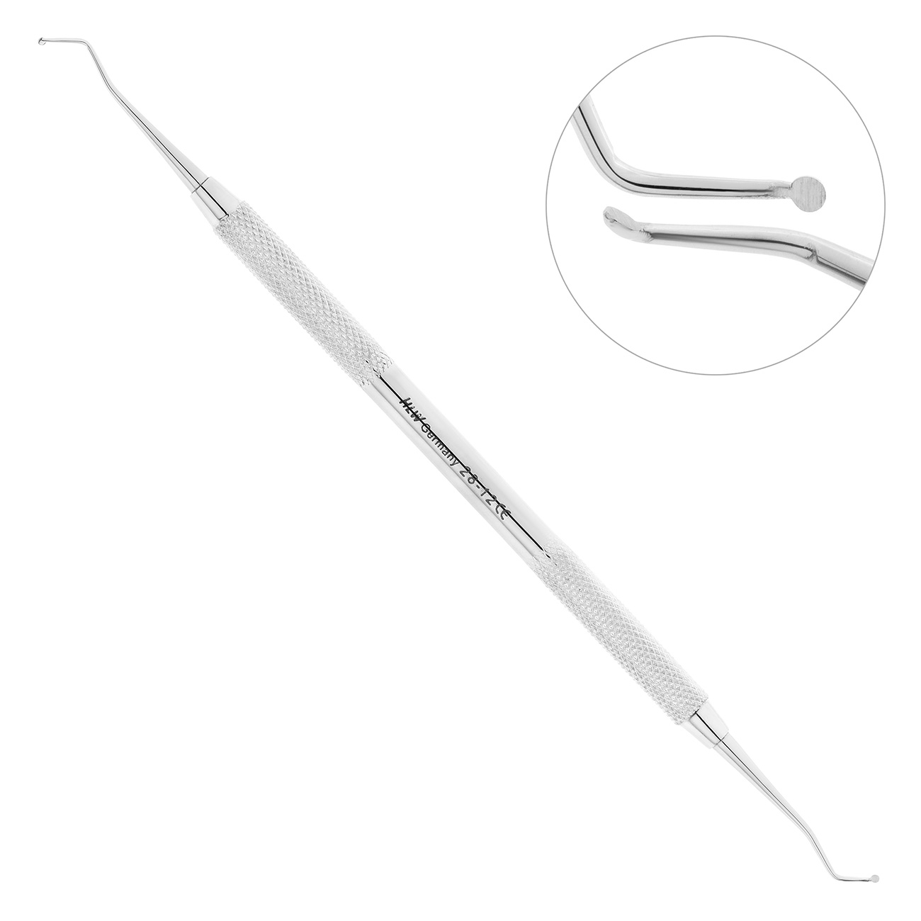 Ручка инструмента двусторонняя. С обоих концов рукоятки расположены зеркально отраженные рабочие части, каждая из которых имеет круглую вогнутую форму с острыми краями. Такая конструкция обеспечивает хороший доступ экскаватора ко всем поверхностям жевательной и центральной группы зубов.