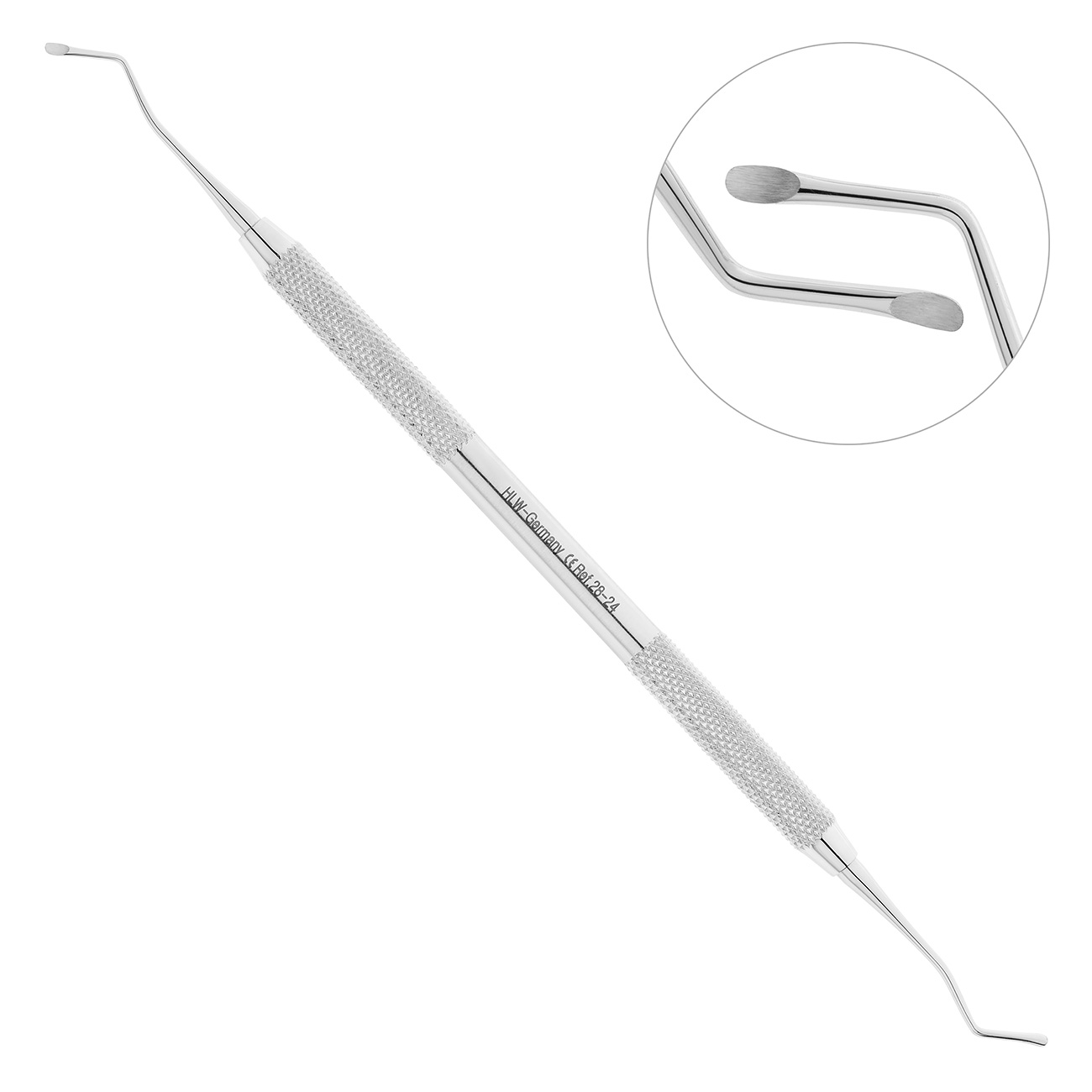 Двусторонний экскаватор представляет собой держатель в виде стержня с двумя остро заточенными овальными ложечками, расположенными с противоположных концов. Рабочая часть ложечек развернута в разные стороны. Такая конструкция инструмента позволяет атравматично извлекать размягченные ткани зуба из кариозной полости.