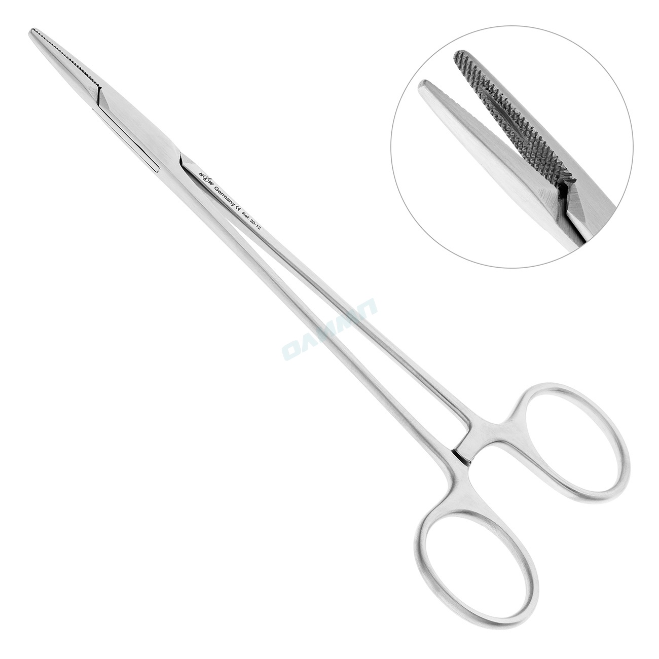 Внутренние рабочие поверхности иглодержателя имеют крестообразные насечки и небольшое углубление в центре. Такая конструкция щечек обеспечивает надежную фиксацию инструмента на плоскости хирургической иглы при наложении шва. Рабочие концы инструмента короткие, массивные и тупоконечные, что упрощает захват и освобождение иглы, а также способствует точному проведению иглы на всех стадиях наложения швов.