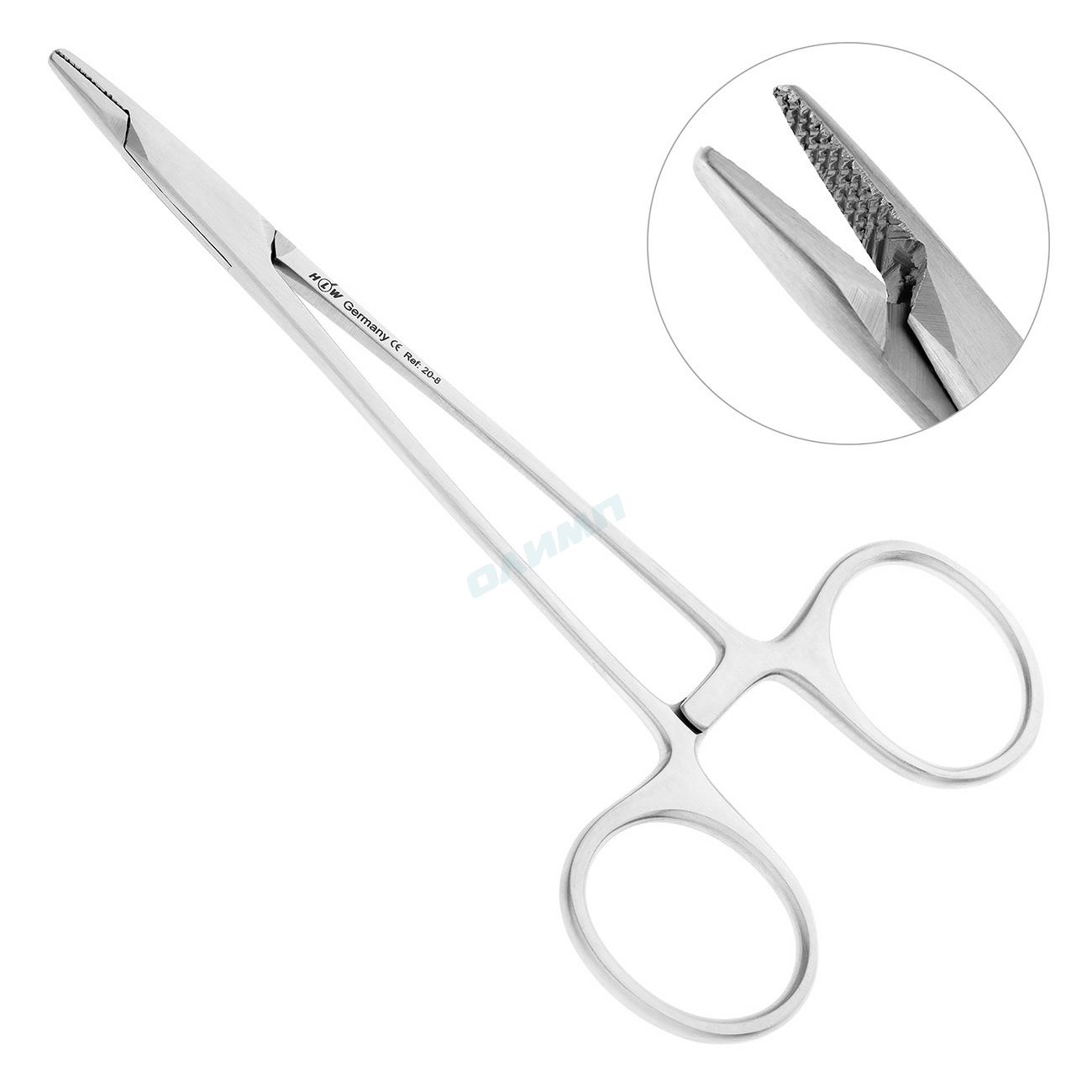 Прямая рабочая часть инструмента на внутренних поверхностях имеет крестообразные насечки, благодаря которым иглодержатель плотно фиксируется на плоскости хирургической иглы и обеспечивает точность проведения иглы на всех стадиях наложения швов.