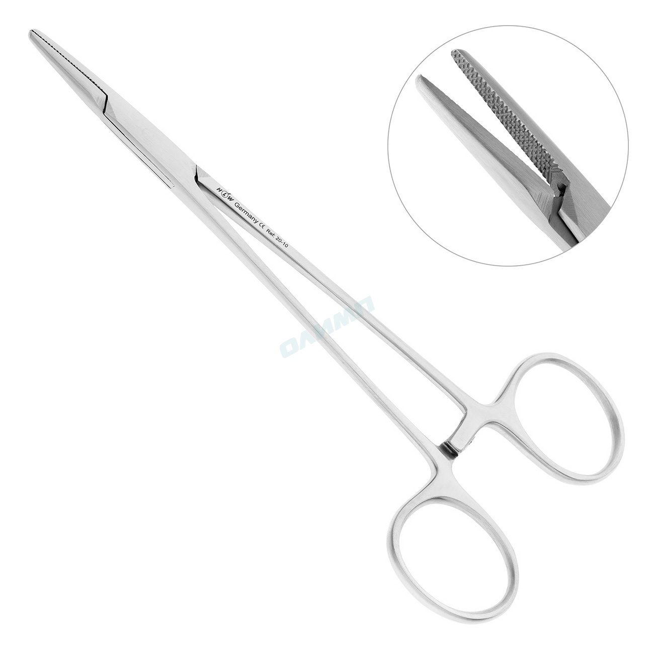 Прямые рабочие части на внутренних поверхностях инструмента покрыты мелкозернистым ретенционным узором, предупреждающим скольжение иглодержателя по плоскости хирургической иглы при наложении шва. Рабочие концы инструмента короткие, массивные и тупоконечные. Такая конструкция щечек иглодержателя упрощает захват и освобождение иглы, а также способствует точному проведению иглы на всех стадиях наложения швов.