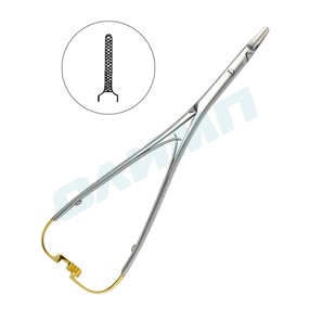 Рабочие части инструмента имеют вытянутую узкую форму, облегчающую захват и освобождение иглы. Благодаря насечкам на внутренних поверхностях иглодержателя инструмент надежно фиксируется и не скользит по плоскости хирургической иглы при наложении шва. Вставки из твердого сплава карбид-вольфрама на внутренних поверхностях щечек иглодержателя обеспечивают повышенную устойчивость к истиранию.