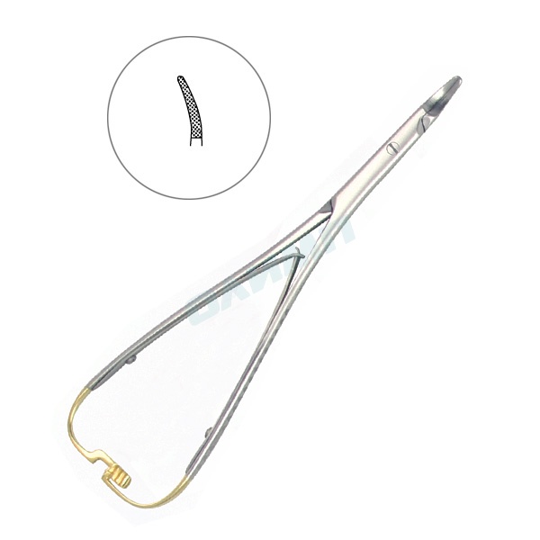 Изогнутые рабочие части инструмента имеют вытянутую узкую форму, облегчающую захват и освобождение иглы, в том числе, на труднодоступных участках полости рта. Благодаря насечкам на внутренних поверхностях щечек иглодержателя инструмент надежно фиксируется и не скользит по плоскости хирургической иглы при наложении шва. Вставки из твердого сплава карбид-вольфрама на внутренних поверхностях щечек иглодержателя обеспечивают повышенную устойчивость к истиранию.