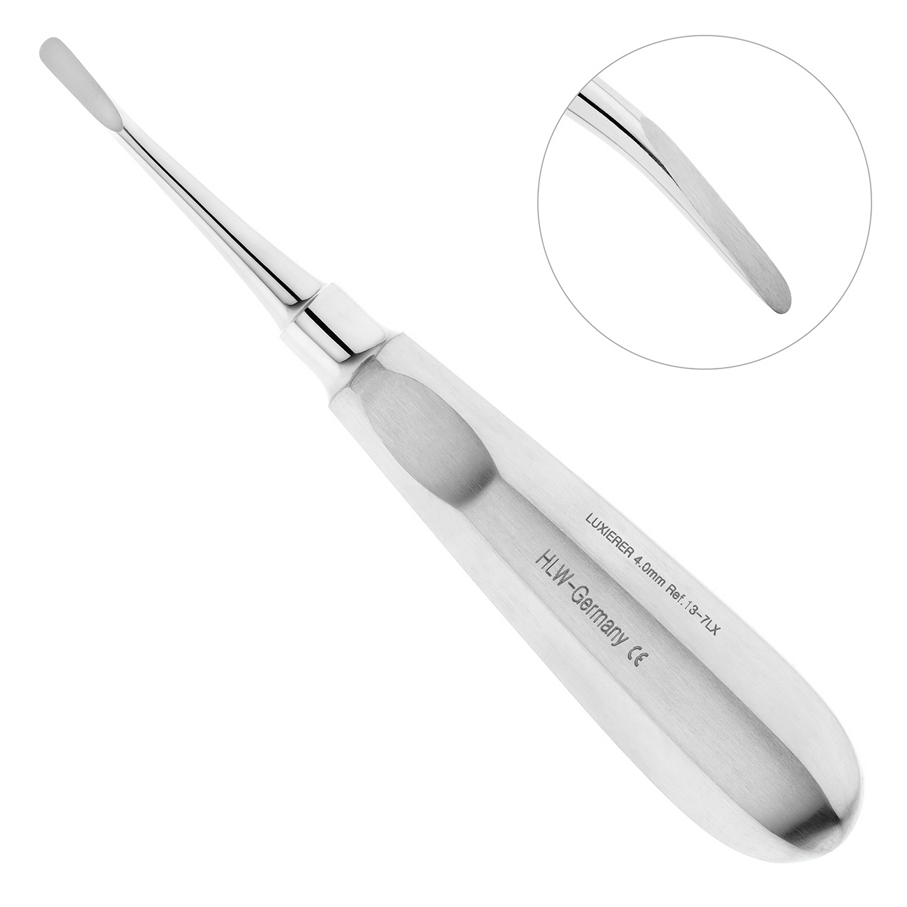 Для деликатного рассечения периодонтальной связки зуба рабочая часть инструмента имеет тонкое режущее лезвие, закругленное на конце. Между соединительным стержнем и рабочей частью люксатора есть небольшой изгиб, который обеспечивает удобный доступ в периодонтальную щель удаляемого зуба.