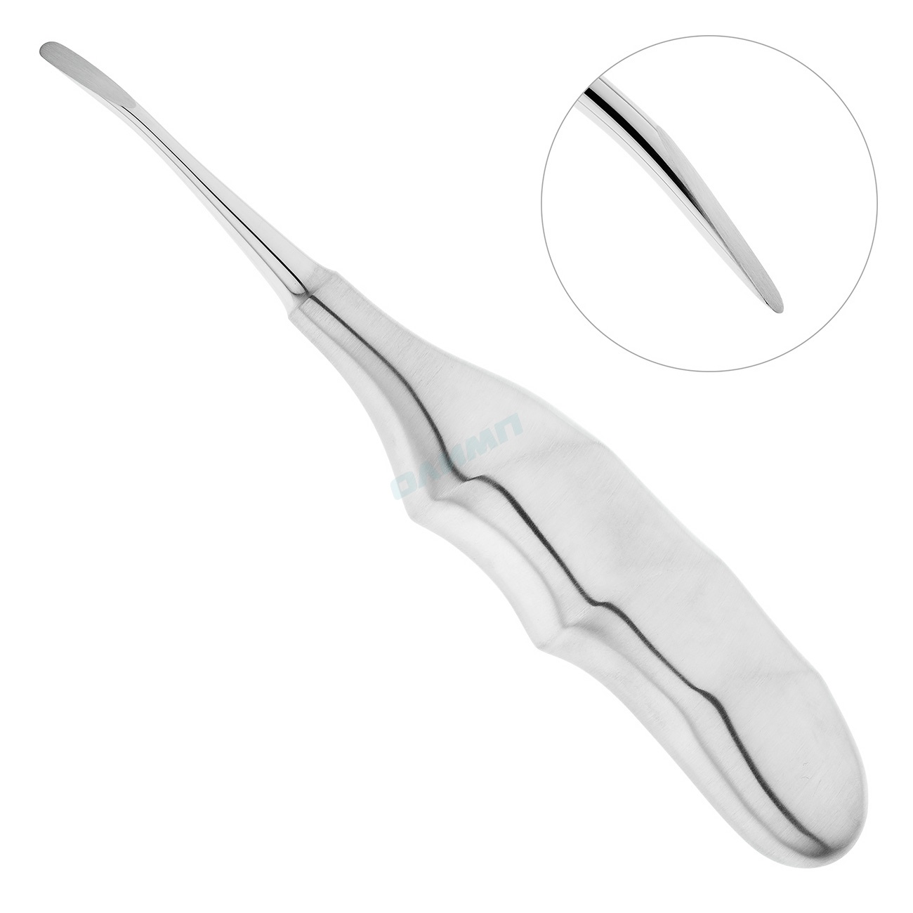 Ручка инструмента легкая, гладкая и имеет эргономически удобные анатомические изгибы под пальцы руки. Проводить операцию по удалению корней или зубов люксатором с такой ручкой очень удобно.