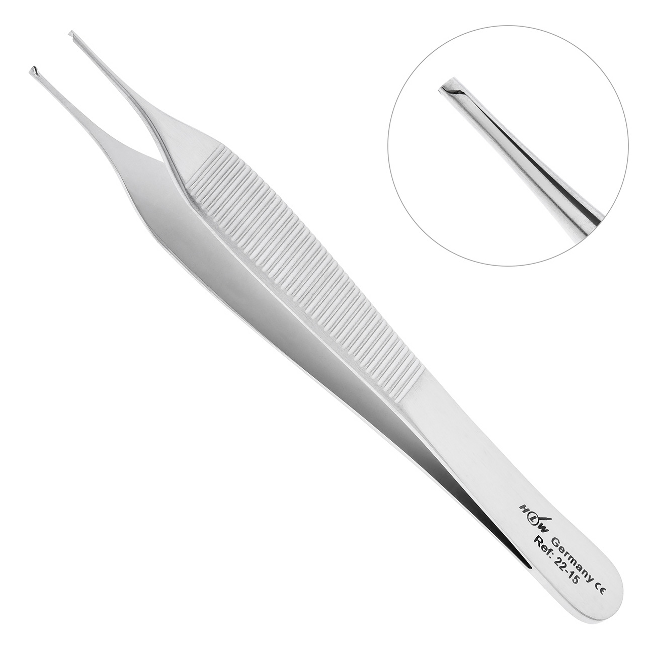Рабочие части инструмента заканчиваются мелкими зубцами, которые при сведении образуют замковое соединение. Зубцы надежно удерживают мягкотканный лоскут, не приводя к плоскостному сдавливанию тканей.
