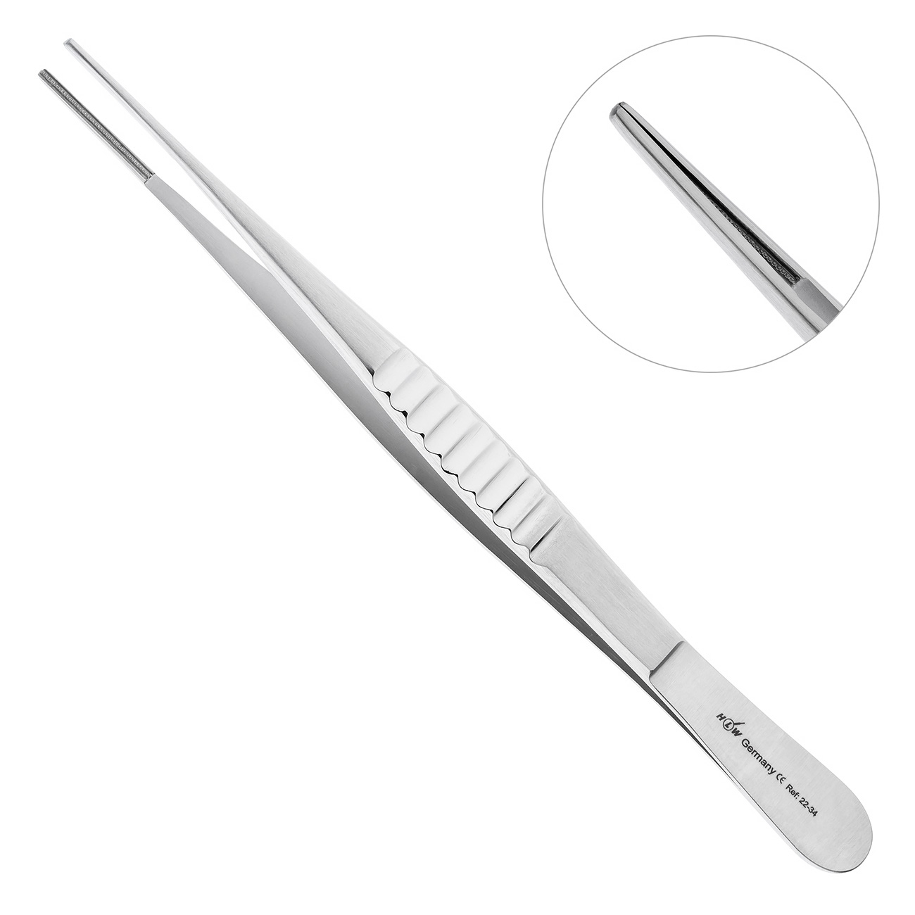 Прямые рабочие поверхности инструмента с одной стороны имеют два ряда мелких зубцов, с другой - один ряд. Такая конструкция пинцета надежно удерживает мягкотканный лоскут и не приводит к его травмированию.