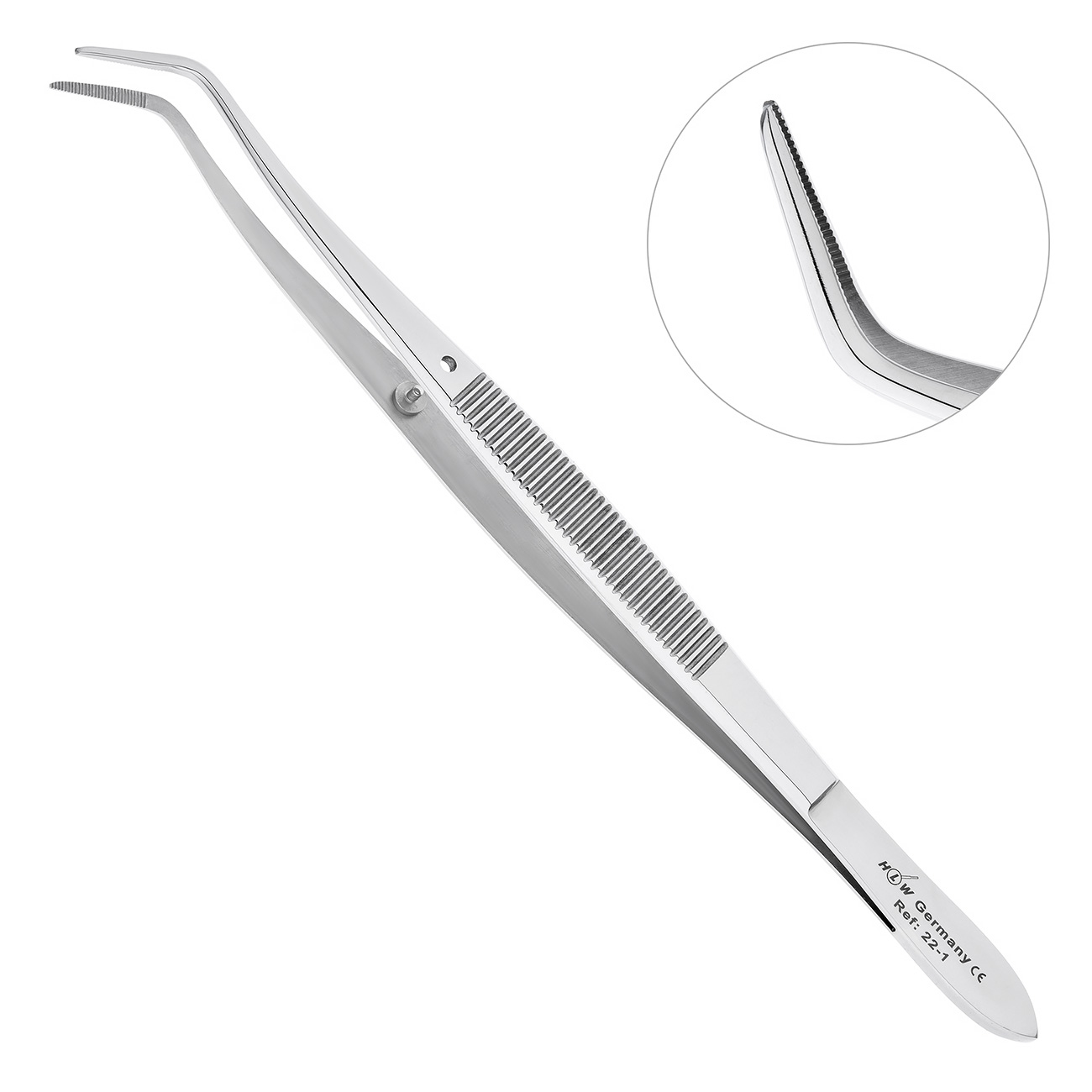 Двойной изгиб по плоскости облегчает ввод пинцета в глубокие и труднодоступные участки полости рта. Удлиненные и тонкие бранши инструмента обеспечивают хороший обзор операционного поля. Рабочие поверхности пинцета с внутренней стороны снабжены продольными атравматическими насечками для деликатного захвата и удерживания мягких тканей в ротовой полости.