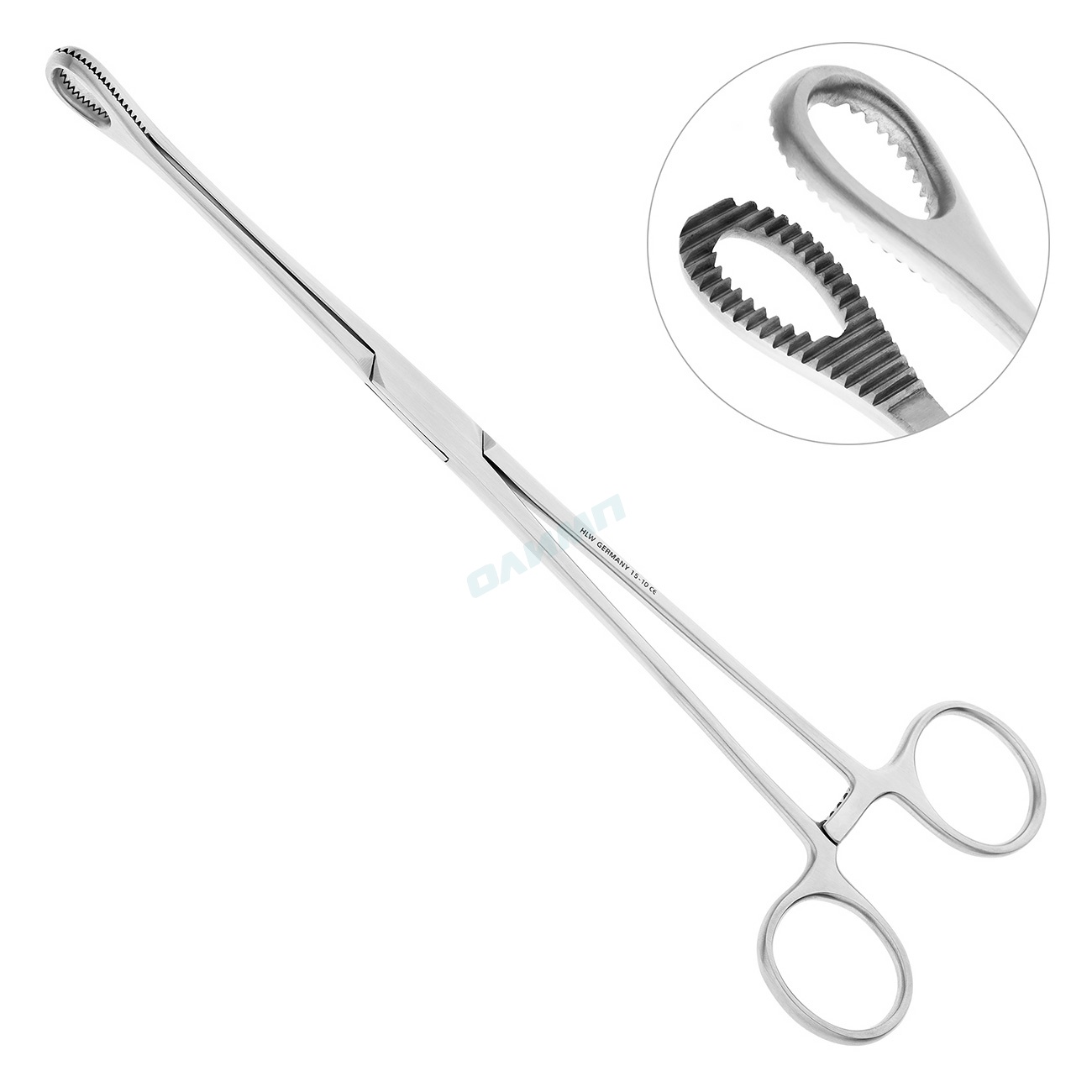 Щечки инструмента на концах имеют уплощения в форме кругов и поперечные ретенционные узоры на внутренних рабочих поверхностях. Благодаря такой конструкции зажим надежно фиксируется на ткани во время процедур по остановке кровотечения.